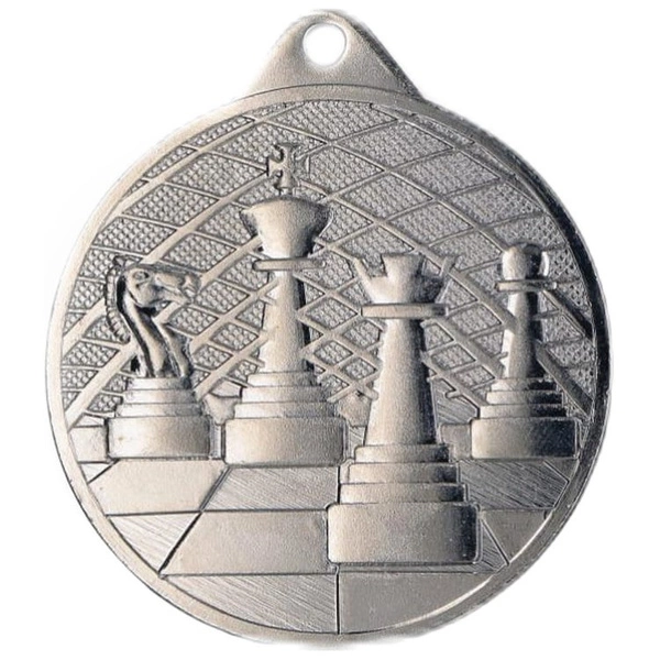 - Medal srebrny stalowy o średnicy 50 mm o tematyce szachowej.