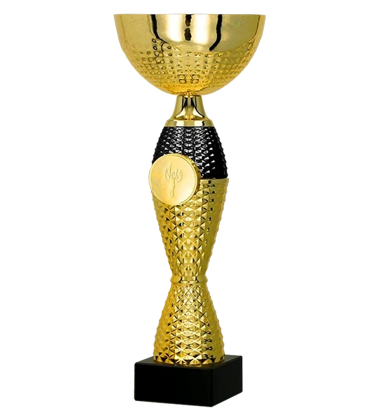 - Złoto-czarny metalowy puchar okolicznościowy z miejscem na emblemat, dzięki czemu puchar może być personalizowany pod różne dyscypliny.