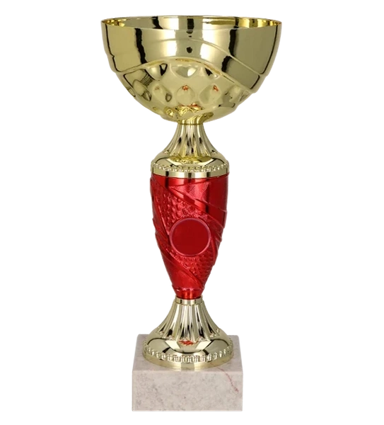 - Okolicznościowy złoto-czerwony puchar z miejscem na emblemat, dzięki któremu można go personalizować do konkretnej dyscypliny. Puchar dostępny w różnych wysokościach.