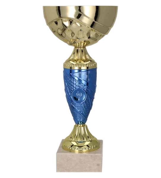 - Okolicznościowy złoto-niebieski puchar z miejscem na emblemat, dzięki któremu można go personalizować do konkretnej dyscypliny.