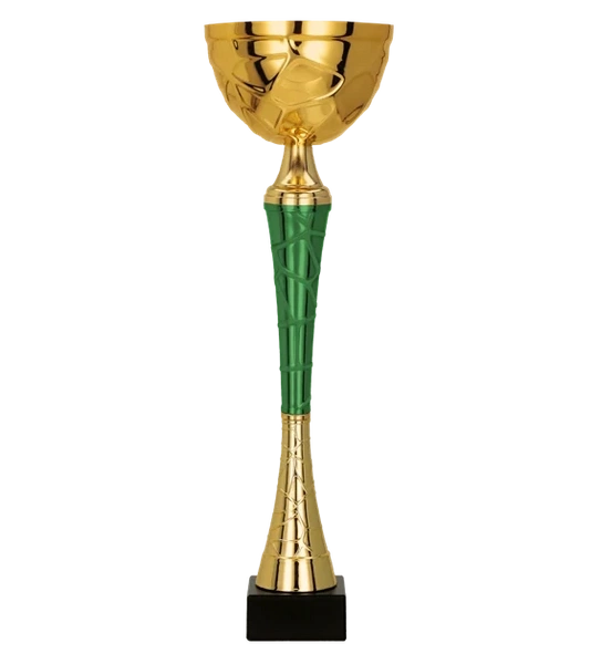 - Złoty, metalowy puchar z elementami zielonego ze względu na swoją uniwersalność może być nagrodą w wielu zawodach.