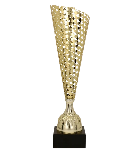 - Elegancki złoty puchar wykonany z metalu umieszczony na stabilnej podstawie. Stworzony z myślą o różnorodnych zawodach. Dostępny w różnych wysokościach.