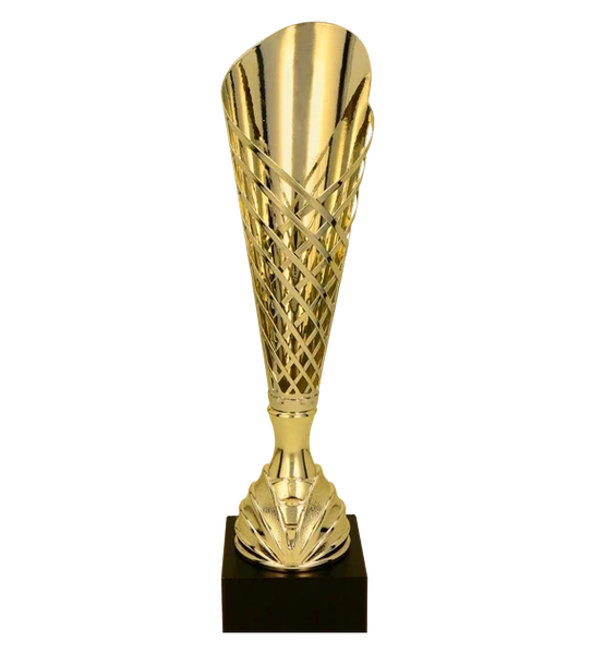 - Elegancki złoty puchar wykonany z metalu umieszczony na stabilnej podstawie. Stworzony z myślą o różnorodnych zawodach. Dostępny w różnych wysokościach.