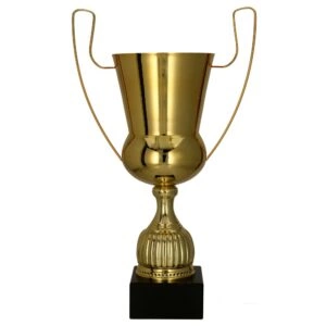 - Złoty, metalowy puchar o klasycznym wyglądzie. Uniwersalny design pozwala uhonorować zwycięzców różnych dyscyplin. Puchar z uszami występuje w różnych wysokościach.