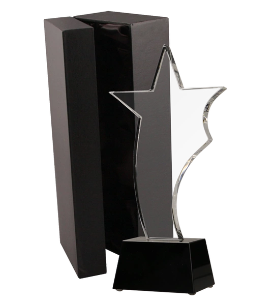 Nowoczesne trofeum szklane o eleganckim wyglądzie. Posiada estetyczną formę i transparentną powierzchnię. Trofeum o wymiarach 25x12cm i grubości 1,5cm.